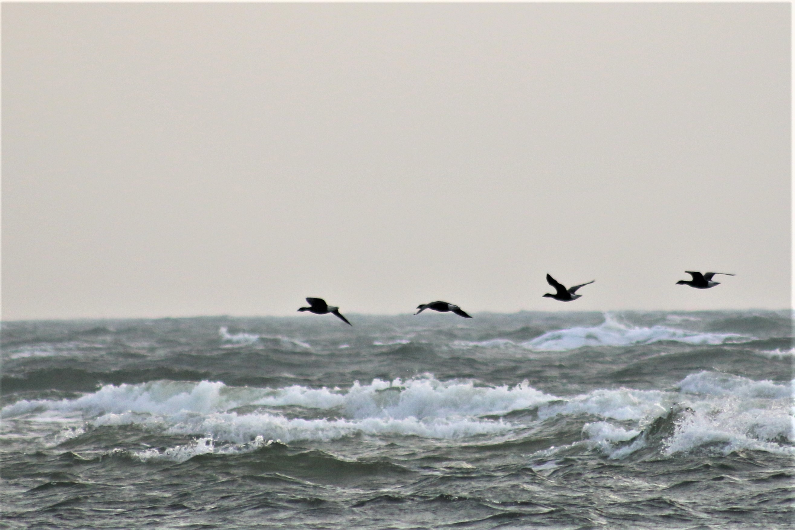 Böhmer har god efaring med havtrækket herude ved Blåvand, så jeg holdte mig ikke tilbage med spørgsmål. Efter at have set en del Rødlommer (Red-throated divers) trække forbi denne morgen bliver jeg nysgerrig på forekomsten af de andre beslægtede Lommer (Divers) her i området. Derfor spørge jeg lidt ind til, hvor ofte man ser Islom (Great northern diver) på disse kanter. Böhmer svarer at de af og til observeres i løbet af året, men at det ikke er hverdagskost. Omkring en 20 min efter råber Böhmer pludselig ISLOM (Great northern diver), og jeg får hurtigt øje på den store fugl. Den kom fræsende forbi på mellemdistancen i en fin vinterdragt. Den fremstod som noget af et brød i sammenligning med de beslægtede Rødlommer (Red-throated divers), der ellers trækker forbi. Fed oplevelse!